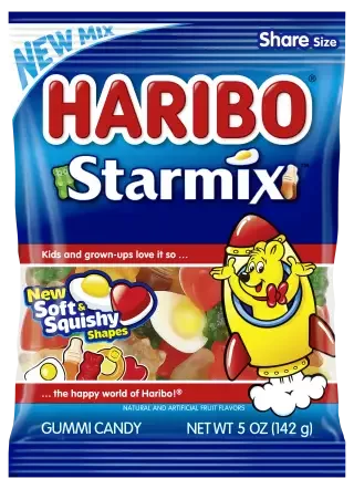 HARIBO Starmix is the ultimate collection of iconic sweet pieces β a bite-sized colorful mix of 5 different playful shapes in a variety of chewy textures & flavors: Goldbear, cola bottle, ring, foam heart, and foam egg.