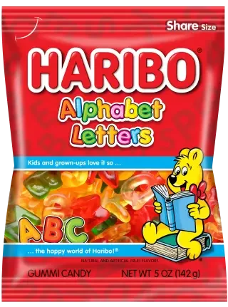 IEUBLADS? NDJIS? Doesnβt matter! Every bite is just as delicious as the last with HARIBO Alphabet Letters, because every bag is full of raspberry, orange, lemon, pineapple, and strawberry gummies for the perfect bite no matter how you spell it!