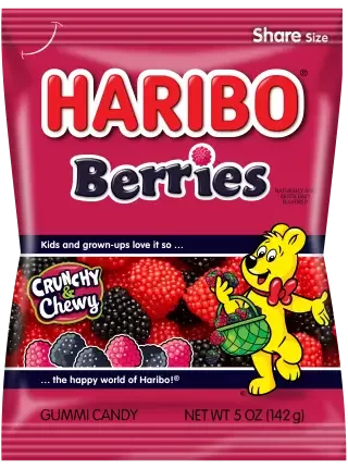 Every bag of HARIBO Berries contains a small bushel of red and black berries right off a HARIBO berry bush! These chewy gummies are a fun combination of soft and crunchy for double the fun.