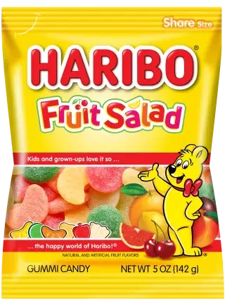 HARIBO Fruit Salad is the perfect collection of sugar-dusted gummies with all your favorite fruit flavors, like Cherry, Peach, Orange, Grapefruit, Lemon, and Passion Fruit. Grab a bag of your new favorite fruit today!