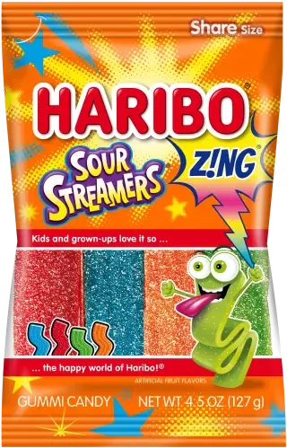 Go crazy for the electrifying flavor of HARIBO Z!NG Sour Streamers! These playful treats pack a punch of sour fun in every bite with flavors like Sour Cherry, Sour Blue Raspberry, Sour Orange, and Sour Apple. Enjoy the stretchable, twistable, bendable fun in every bag!