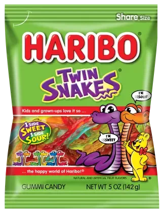 Sssweet and Sssour Twin Snakes are closely coiled together in a pack of delicious gummies with flavors like Cherry & Orange, Apple & Lemon, and Blueberry & Blackcurrant. Eat them together or pull them apart for double the fun!