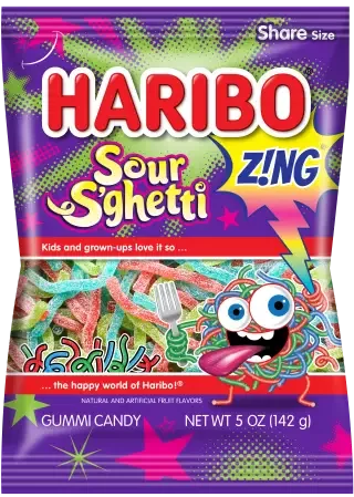 Are you ready for the crazy sour flavors of HARIBO Sour Sβghetti? Extra-sour strands of sugar-coated Strawberry, Blueberry, Green Apple, and Watermelon tangle and tango together in every bag.