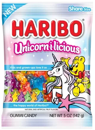 Introducing HARIBOβs latest enchanting creation: Unicorn-i-licious! Immerse yourself in a world of whimsy and flavor with our delightful unicorn-shaped gummies, in a kaleidoscope of colors and six spellbindingly delicious flavors: Apple, Blue Raspberry, Berry Punch, Banana, and for the first time, Cotton Candy and Tangerine. Crafted with care and a sprinkle of magic, Unicorn-i-licious is the perfect treat for unicorn enthusiasts, dreamers, and anyone seeking a taste of pure enchantment.