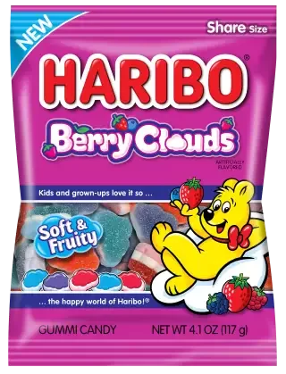 Get ready to float into cloud nine! Introducing NEW HARIBO Berry Clouds, featuring a triple-layer foam gummi with a soft, cloud-like texture. Every bag of Berry Clouds packs Blueberry, Wildberry, and Strawberry flavors into dreamy cloud shapes.
